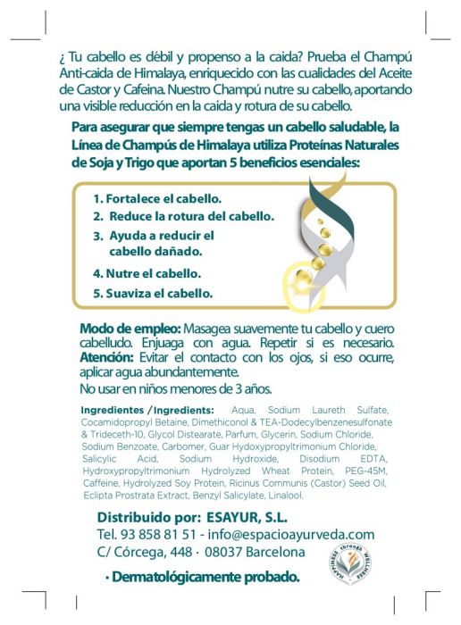 Tu cabello es débil y propenso a la caida? Prueba el Champú Anti-caida de Himalaya, enriquecido con las cualidades del Aceite de Castor y Cafeina. Nuestro Champú nutre su cabello, aportando una visible reducción en la caida y rotura de su cabello.Para asegurar que siempre tengas un cabello saludable, la Línea de Champús de Himalaya utiliza Proteínas Naturales de Soja y Trigo que aportan 5 beneficios esenciales: