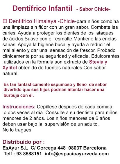 El Dentífrico Himalaya Chicle para niños combina una limpieza sin flúor con un gran sabor. Combate las caries Ayuda a proteger los dientes de los ataques de ácidos.Suave con el esmalte.Mantiene las encías sanas. Apoya la higiene bucal y ayuda a reducir el mal aliento y dar una sensación de frescor. Probado clínicamente por su seguridad y eficacia. Edulcorantes utilizados en la fórmula son extracto de Stevia y Xylitol obtenido de fuentes naturales.Con sabor natural.Es tan fantásticamente espumoso y lleno de sabor divertido que sus hijos podrían intentar hacer una burbuja con él.